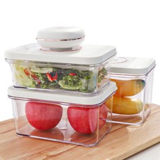 뉴리스 원터치 진공 밀폐 용기 세트는 대형, 중형, 소형 용기와 진공펌프가 포함되어 식재료를 신선하게 보관하고 장기간 보관에도 용이하다.